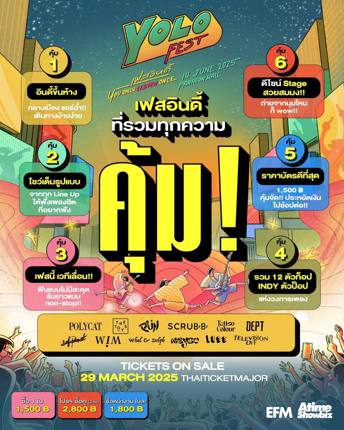 YOLO FEST เฟสอินดี้ “YOU ONLY LISTEN ONCE” มิวสิคเฟสที่รวม 12 ศิลปินอินดี้ตัวท็อป มาไว้ในเวทีเดียวกัน จาก ATIMESHOWBIZ และ EFM เกิดมาทั้งที ต้องมาดูมาฟังมิวสิคเฟสนี้สักครั้ง เพราะเรารวมที่สุดของความ ‘คุ้ม’ มาไว้ในงานเดียว!