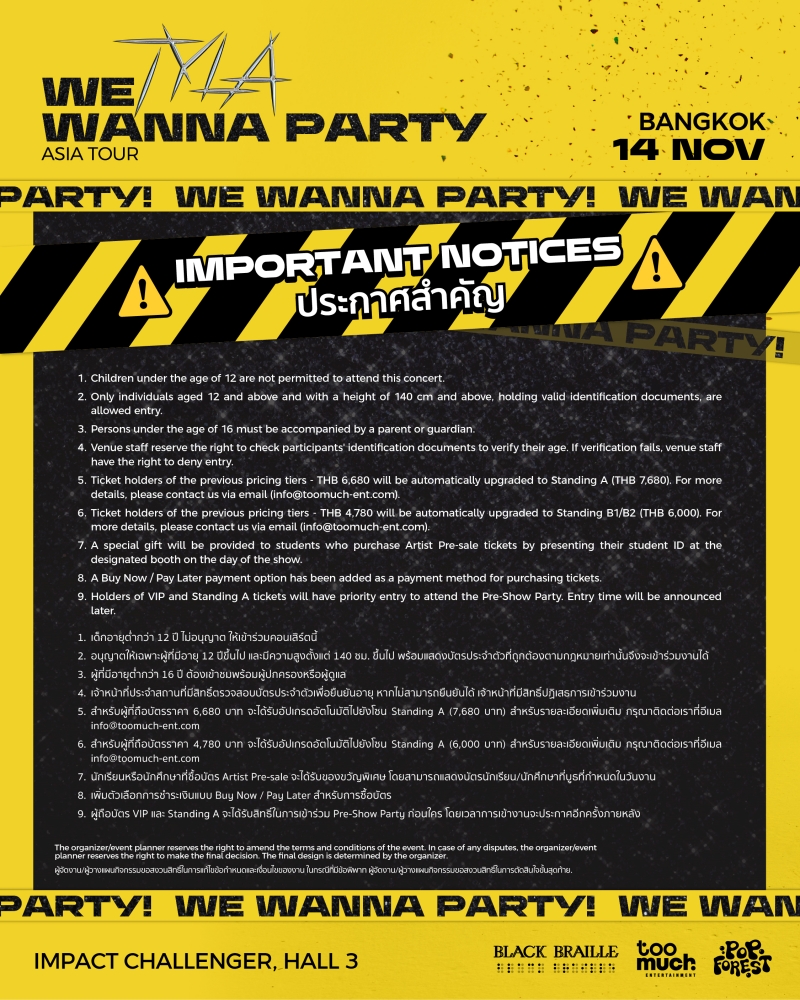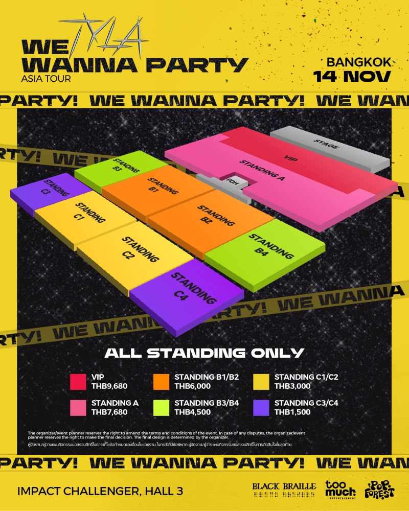 เมื่อแฟนๆ ขอมา เราจัดให้! กับการเพิ่มโซนใหม่พร้อมราคาปรับใหม่ให้โดนใจ เพื่อโชว์นี้ที่กรุงเทพฯ โดยเฉพาะ เพื่อมอบความคุ้มค่าให้แฟน ๆ ของเรา เตรียมตัว เตรียมใจ และปล่อยจอยไปกับปาร์ตี้ TYLA WE WANNA PARTY ASIA TOUR in Bangkok ได้แล้วในวันที่ 14 พฤศจิกายน ณ Impact Challenger Hall 3 โดยบัตรราคา 9,680 บาท / 7680 บาท / 6,000 บาท / 4,500 บาท / 3,000 บาท / 1,500 บาท สามารถซื้อได้แล้วทาง Megatix ตั้งแต่วันที่ 17 กันยายนเป็นต้นไป