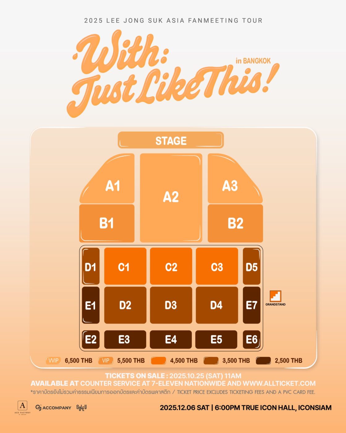Tickets 6,500 / 5,500 / 4,500 / 3,500 / 2,500 บาท (ราคาไม่รวมค่าธรรมเนียมการออกบัตรและค่าบัตรพลาสติก)