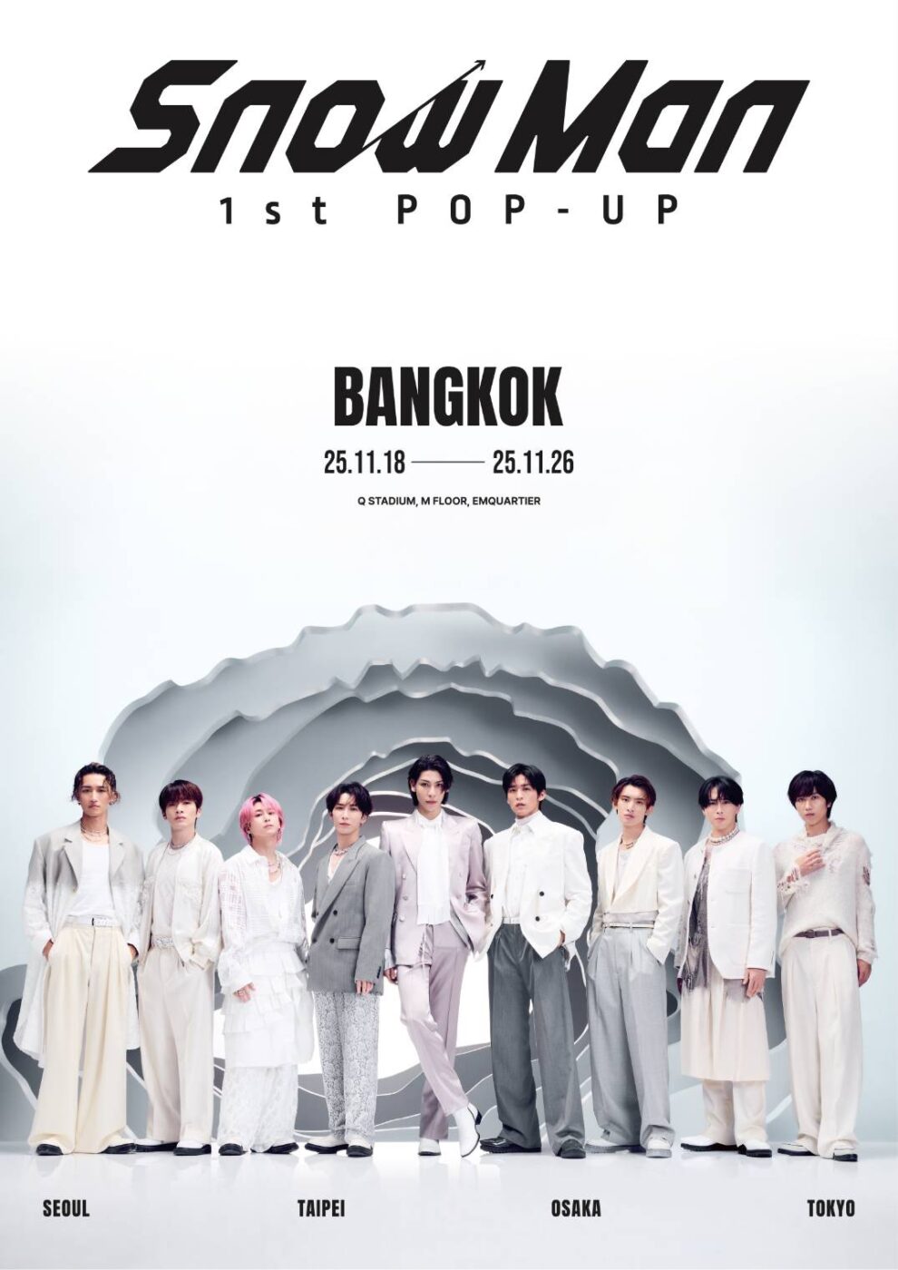 หลังจากประสบความสำเร็จอย่างยิ่งใหญ่ที่กรุงโซล และเตรียมจัดที่ไทเปต่อเนื่อง ศิลปินกลุ่มไอดอลชั้นนำจากญี่ปุ่น Snow Man เตรียมเปิดตัว Pop-Up Store ครั้งแรกในประเทศไทย ในเดือนพฤศจิกายนนี้ โดยจะจัดขึ้นระหว่างวันที่ 18 – 26 พฤศจิกายน 2568 ณ Q STADIUM ชั้น M ศูนย์การค้า EMQUARTIER