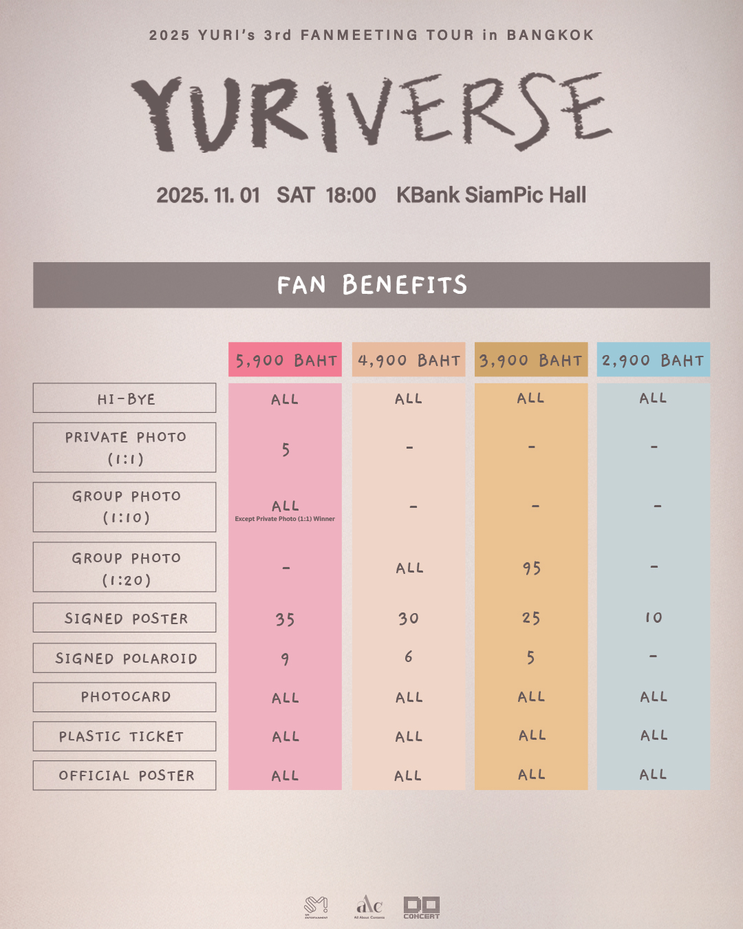 วันเสาร์ที่ 1 พฤศจิกายน 2568 เวลา 18:00 น. ที่เคแบงก์สยามพิฆฮอลล์ บัตรราคา 5,900 / 4,900 / 3,900 / 2,900 บาท พร้อมสิทธิพิเศษ Hi-Bye ทุกที่นั่ง สามารถซื้อบัตรที่ได้ที่ Do Concert Ticket หรือ https://bit.ly/YURIVERSEinBKK และสามารถติดตามทุกความเคลื่อนไหวของกิจกรรมได้ที่แฮชแท็ก #YURIVERSEinBKK