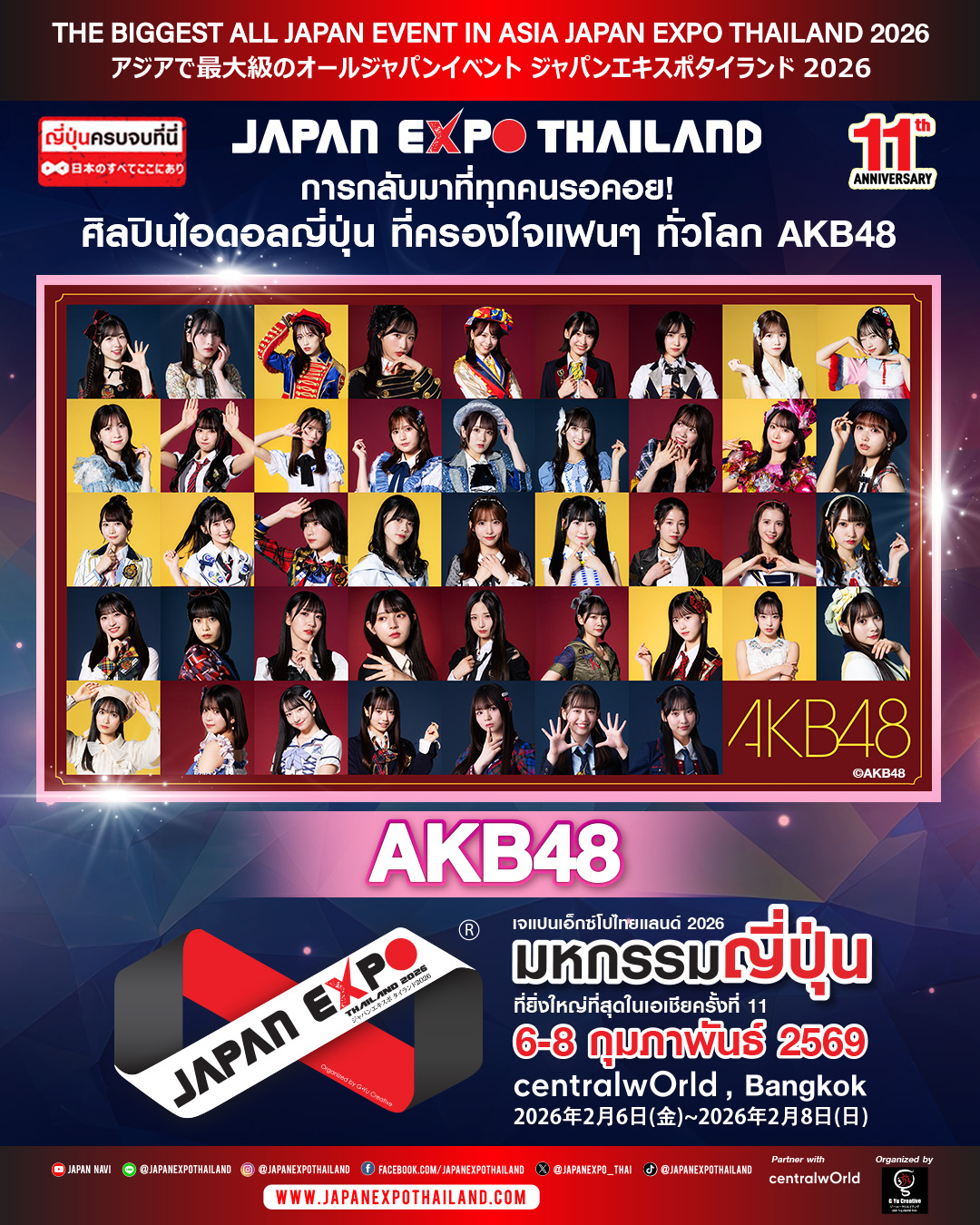 ข่าวดีที่ทำเอาแฟนคลับชาวไทยของไอดอลแห่งชาติอย่าง AKB48 ต้องกรี๊ดลั่น หลังจากห่างหายจากเวทีไทยไปพักใหญ่ ไอดอลกรุ๊ปที่สร้างประวัติศาสตร์และคำว่า ‘ไอดอลแห่งชาติ’ ให้โลกได้รู้จัก กำลังจะกลับมาสร้างความประทับใจสุดยิ่งใหญ่ให้กับแฟนๆ ชาวไทยอีกครั้ง ในงานมหกรรมญี่ปุ่นที่ใหญ่ที่สุดในเอเชียอย่าง JAPAN EXPO THAILAND 2026 ที่เตรียมจัดขึ้นระหว่างวันที่ 6-8 กุมภาพันธ์ 2569 ณ ศูนย์การค้าเซ็นทรัลเวิลด์!!