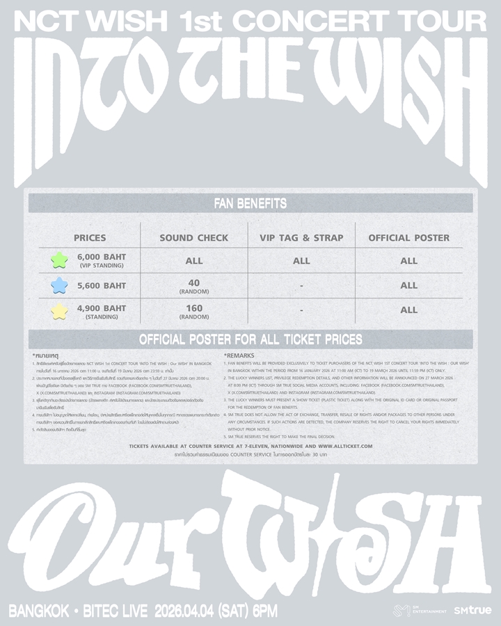 *เปิดจำหน่ายบัตรรอบสมาชิก “NCTzen WISH” Membership (GL) Pre-Sale ในวันศุกร์ที่ 16 มกราคม 2026 เวลา 11:00 น. – 20:59 น. เท่านั้น และรอบบุคคลทั่วไป (General Sale) ในวันอาทิตย์ที่ 18 มกราคม 2026 ตั้งแต่เวลา 11:00 น. เป็นต้นไป ทางเคาน์เตอร์เซอร์วิสในร้าน 7-Eleven ทุกสาขาทั่วประเทศ และทางเว็บไซต์ www.allticket.com/event/NCTWISH_OurWISH_BANGKOK