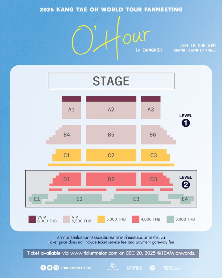 Tickets 6,000 (VVIP) / 5,500 (VIP) / 5,000 / 4,000 / 3,000 บาท