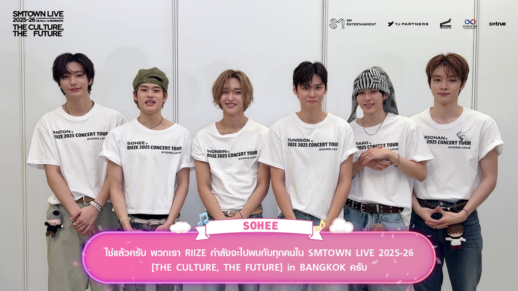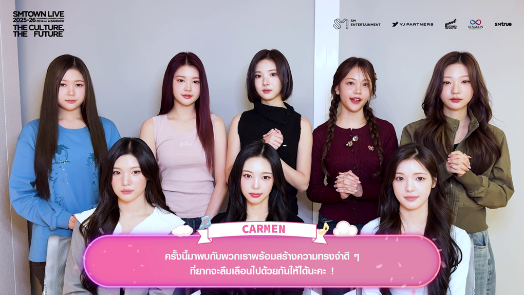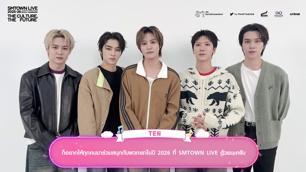 เหล่าศิลปินจากค่าย SM ENTERTAINMENTส่งความรักและคิดถึงมาทักทายแฟนคลับชาวไทย ยืนยันความพร้อมในการเดินทางมาสร้างความประทับใจครั้งยิ่งใหญ่ในคอนเสิร์ตระดับโลก SMTOWN LIVE 2025-26 [THE CULTURE, THE FUTURE] in BANGKOK ซึ่งจะจัดขึ้นในวันเสาร์ที่ 14 กุมภาพันธ์ 2026 เวลา 18:00 น. ณ ราชมังคลากีฬาสถาน สเตเดียมที่ใหญ่ที่สุดในประเทศไทย
