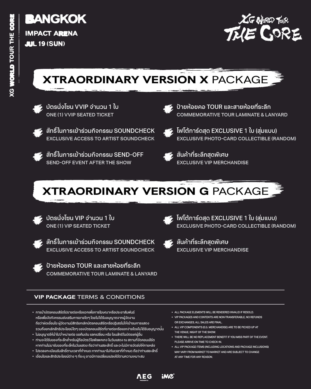 สำหรับเหล่าหมาป่าที่เตรียมร่วมสัมผัสประสบการณ์ระดับโลก เตรียมตัวให้พร้อม! บัตรเข้าชมงาน XG WORLD TOUR: THE CORE IN BANGKOK ราคาเริ่มต้นที่ 2,500 บาท โดยแฟนคลับตัวจริงสามารถคว้าสิทธิ์จับจองที่นั่งก่อนใครในรอบ ALPHAZ ANNUAL PREMIUM/STANDARD・MONTHLY PAID MEMBERS PRESALE ในวันพุธที่ 6 พฤษภาคม 2569 เวลา 10.00 – 23.59 น. และเปิดขายบัตรรอบ ALL ALPHAZ MEMBERS (INCLUDING FREE MEMBERS) PRESALE ในวันพฤหัสบดีที่ 7 พฤษภาคม 2569 เวลา 10.00 – 23.59 น. ผ่านทาง www.thaiticketmajor.com (ดูรายละเอียดเพิ่มเติมเกี่ยวกับรอบ ALPHAZ Pre-Sale ได้ที่ http://xgalx.com/) สำหรับรอบจำหน่ายบัตรทั่วไป จะเริ่มเปิดขายในวันศุกร์ที่ 8 พฤษภาคม 2569 เวลา 10.00 น. เป็นต้นไป ผ่านทาง www.thaiticketmajor.com หรือ เคาน์เตอร์ไทยทิกเก็ตเมเจอร์ทุกสาขา Call Center 02-262-3456